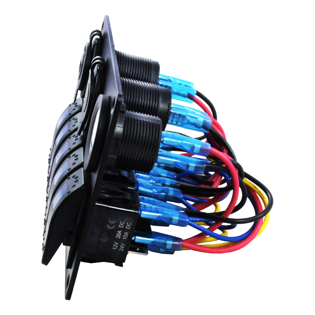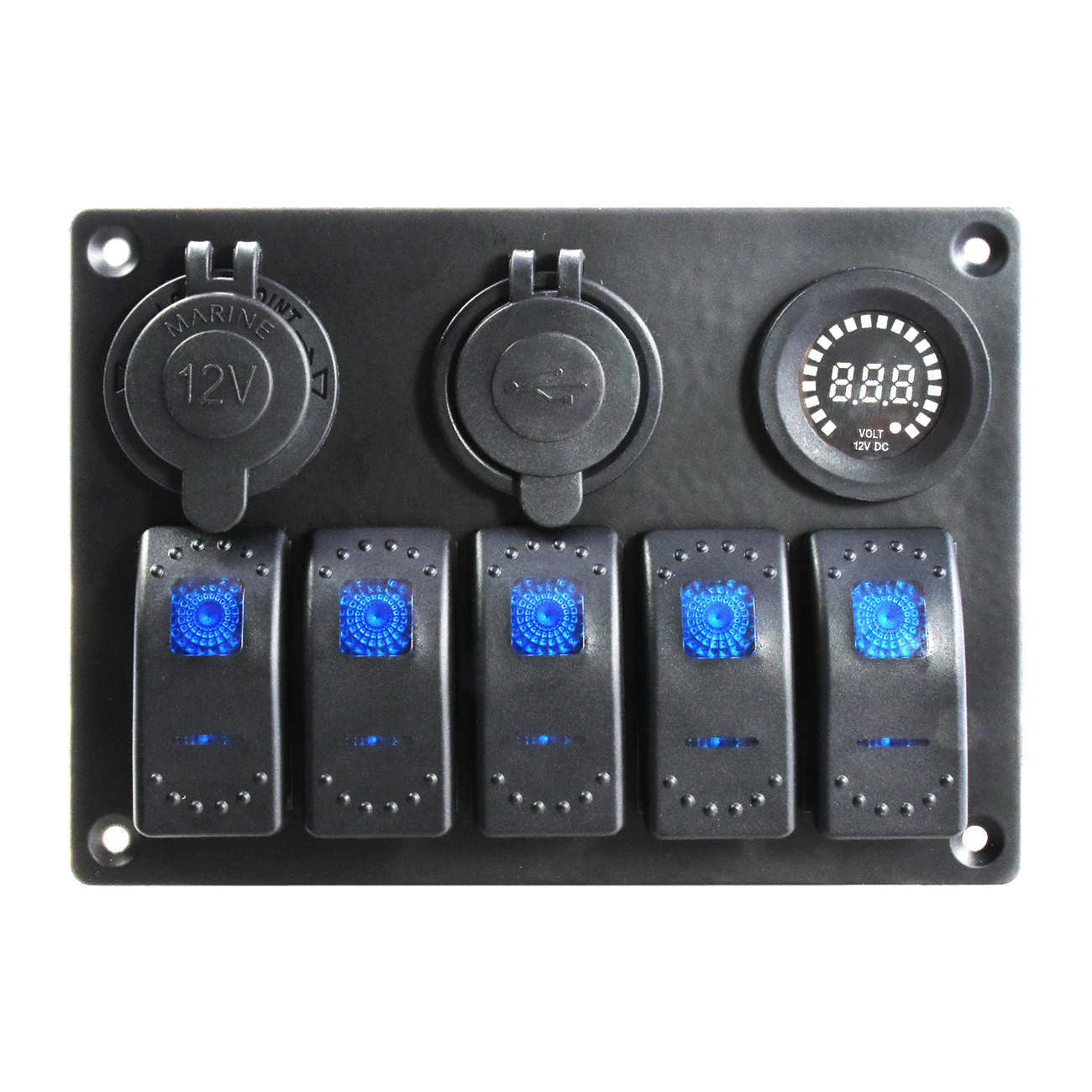 船用小艇摇杆开关面板5位开关点火防水,带数字电压表3.1A双USB充电器点烟器插座